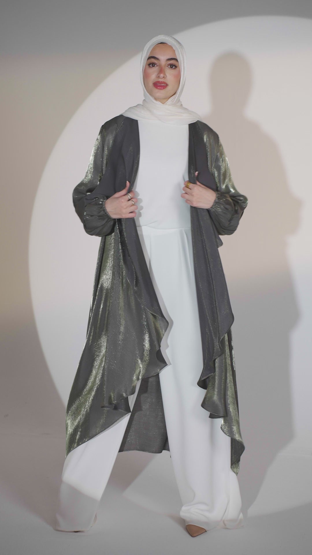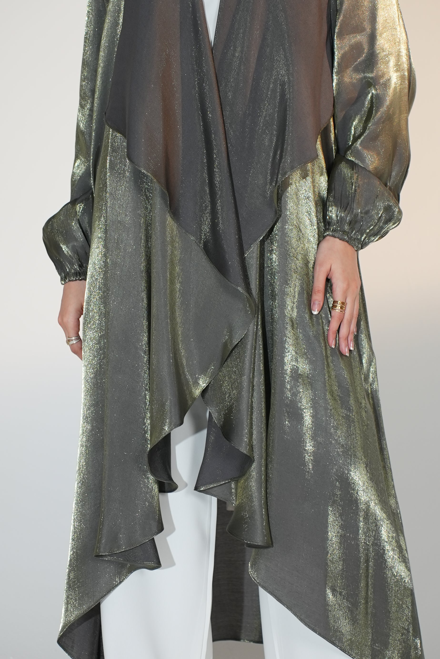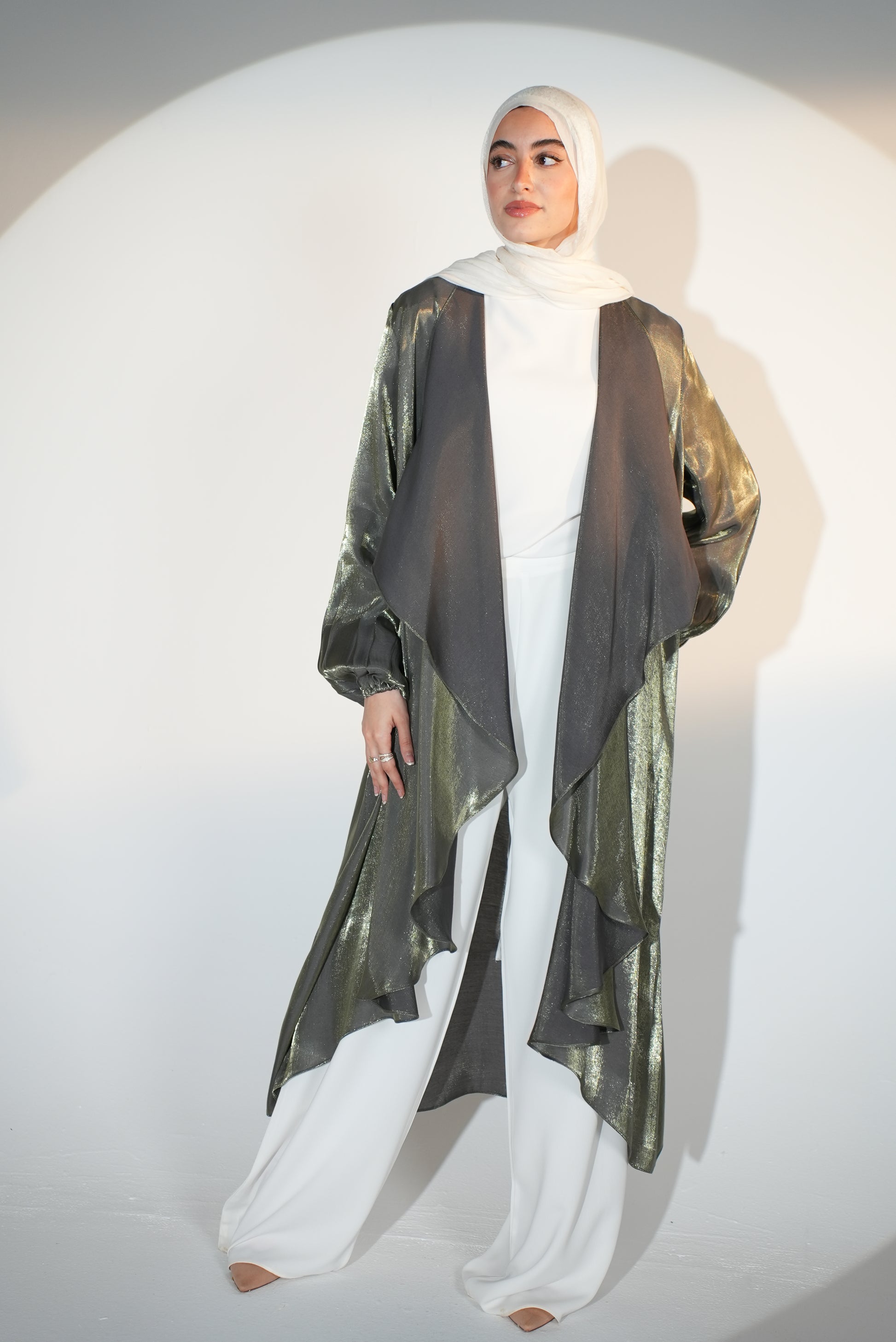 Effortlessly elevate your style with the Emilia Kaftan in Greyish Olive. Its shimmery color is sure to catch people's eye, while the easy-to-style design makes it a versatile addition to your wardrobe. Perfect for any occasion, this kaftan offers both comfort and style.
