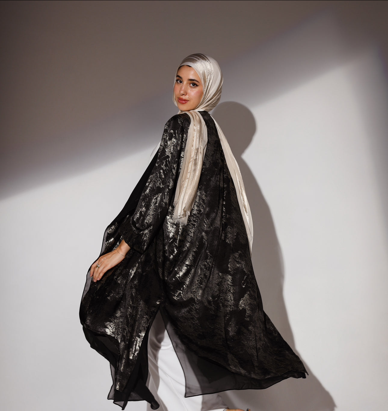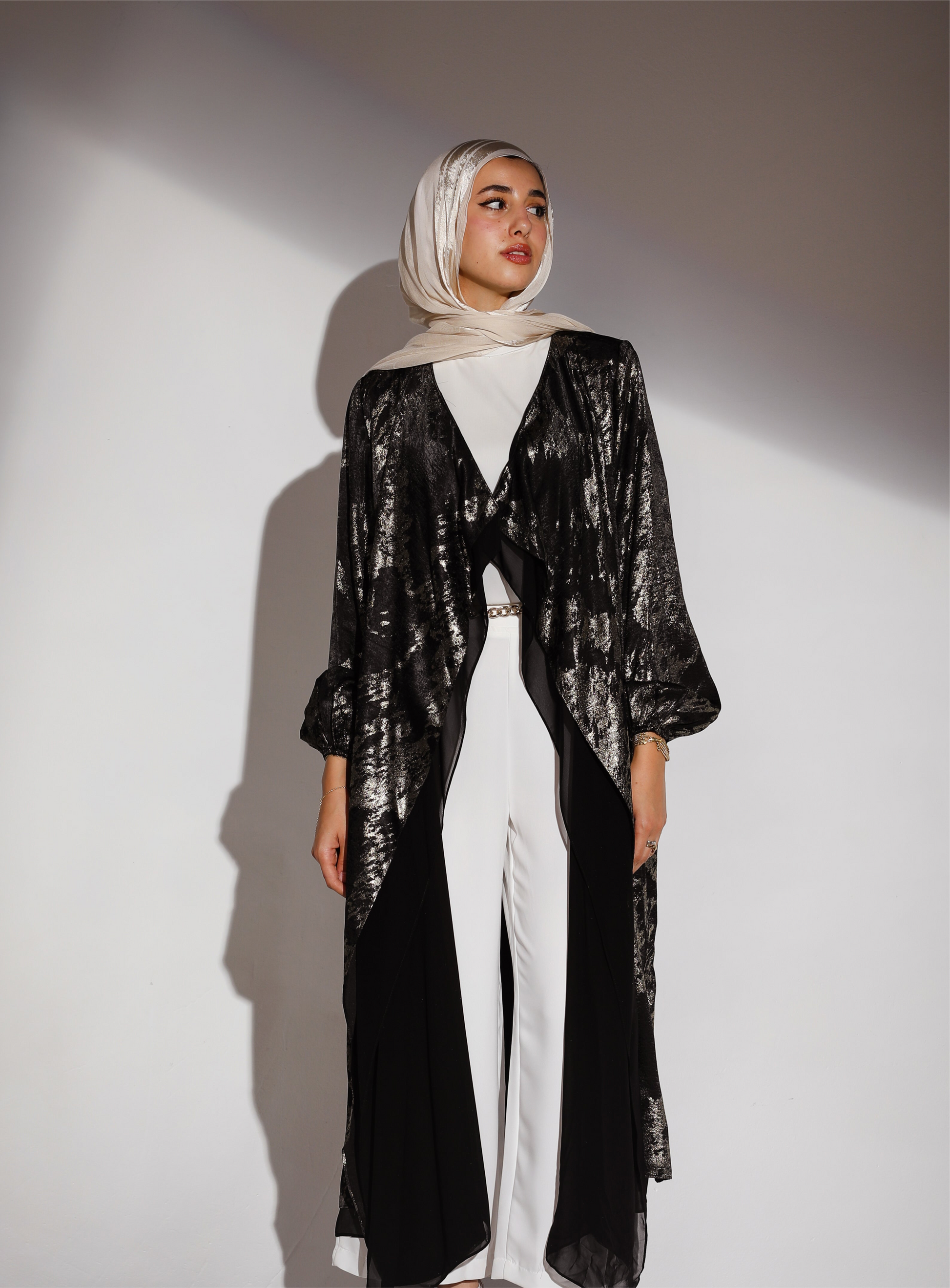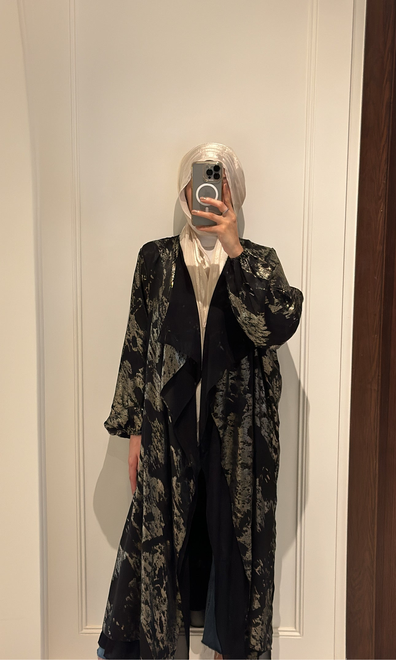 Introducing the Hazie Trench in Black x Gold Wash. This limited edition trench boasts a kaftan silhouette and an oversized fit, perfect for layering. It comes with a belt for added style and features side slits for ease of movement.