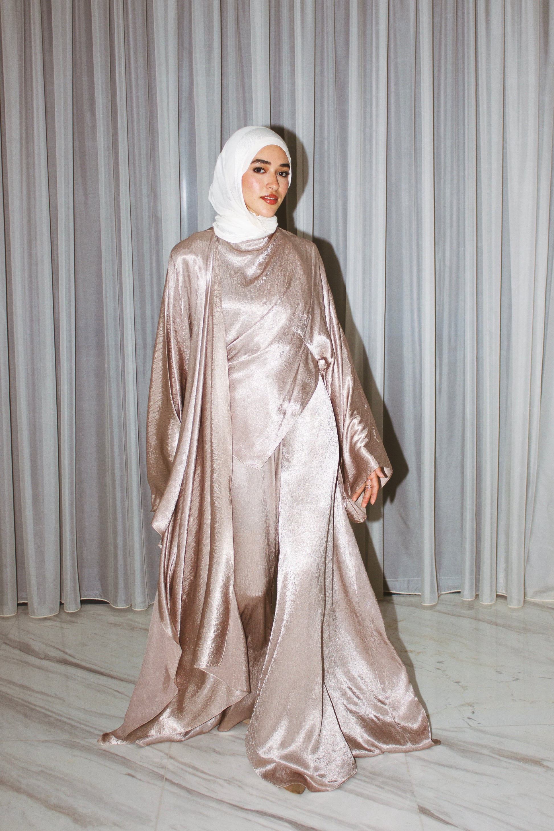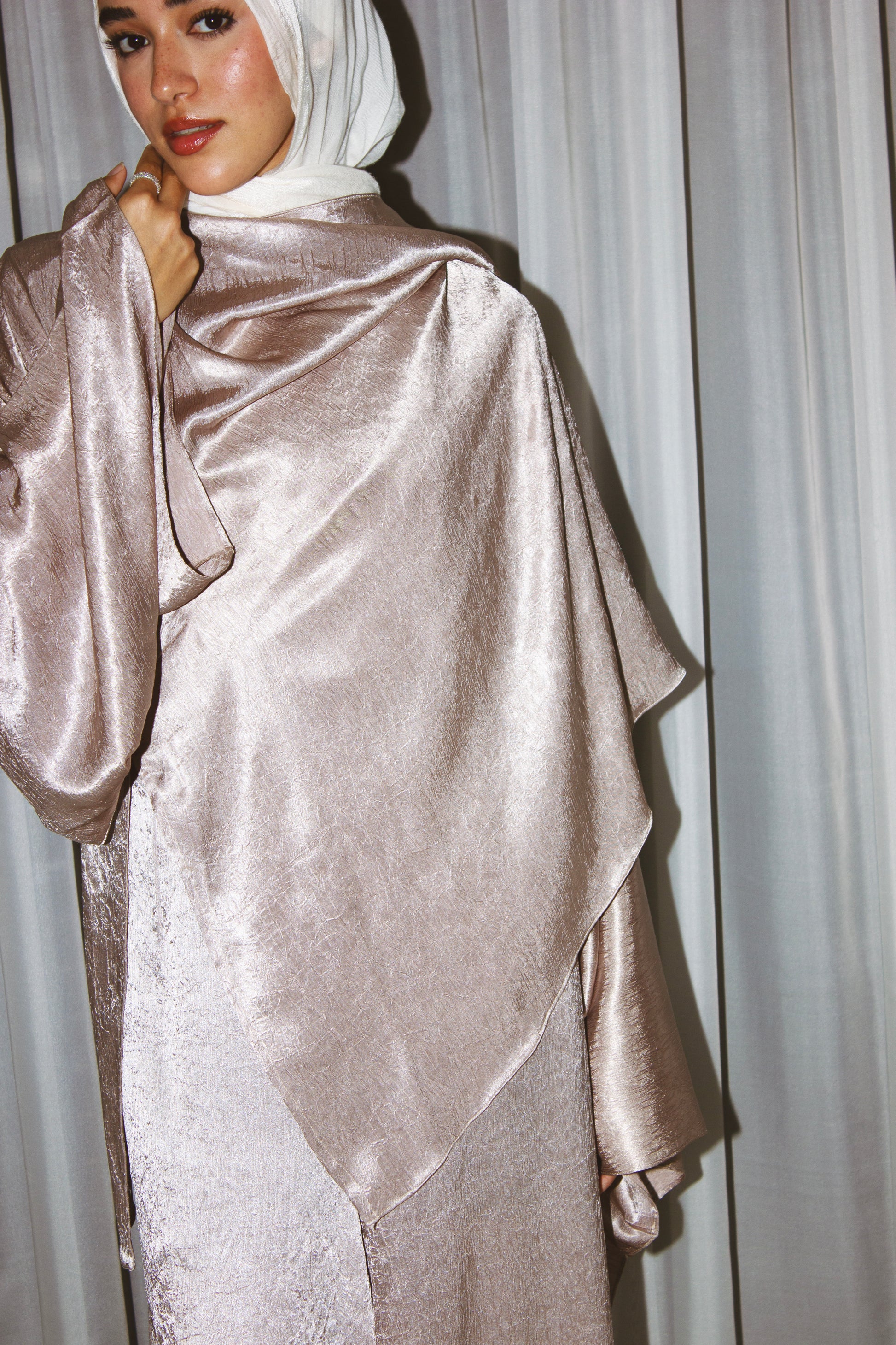 Upgrade your wardrobe with our Head Turner Shawl set in Rosè. Made from premium Turkish textured satin, this statement set is not only stylish but incredibly comfortable. Plus, its versatile design allows you to wear it in three different ways. Elevate your fashion game with this must-have set.