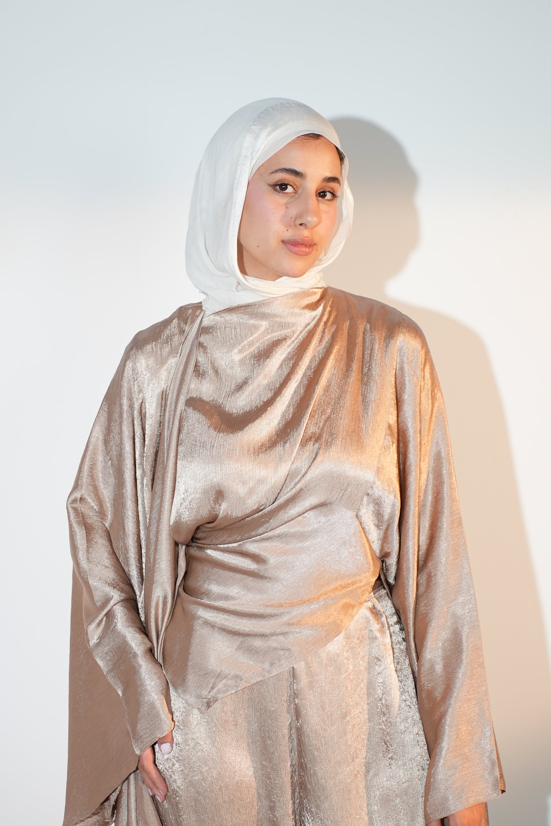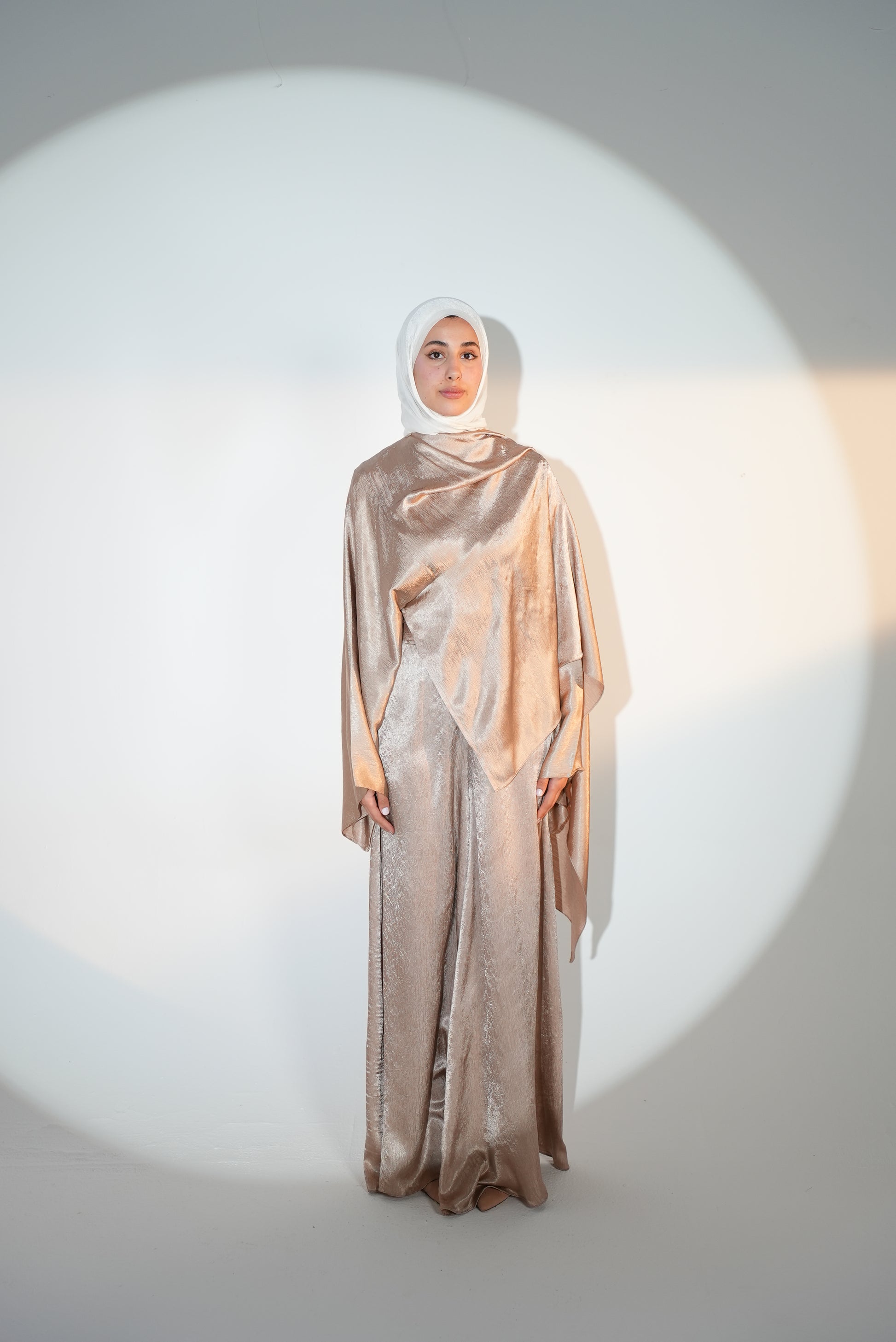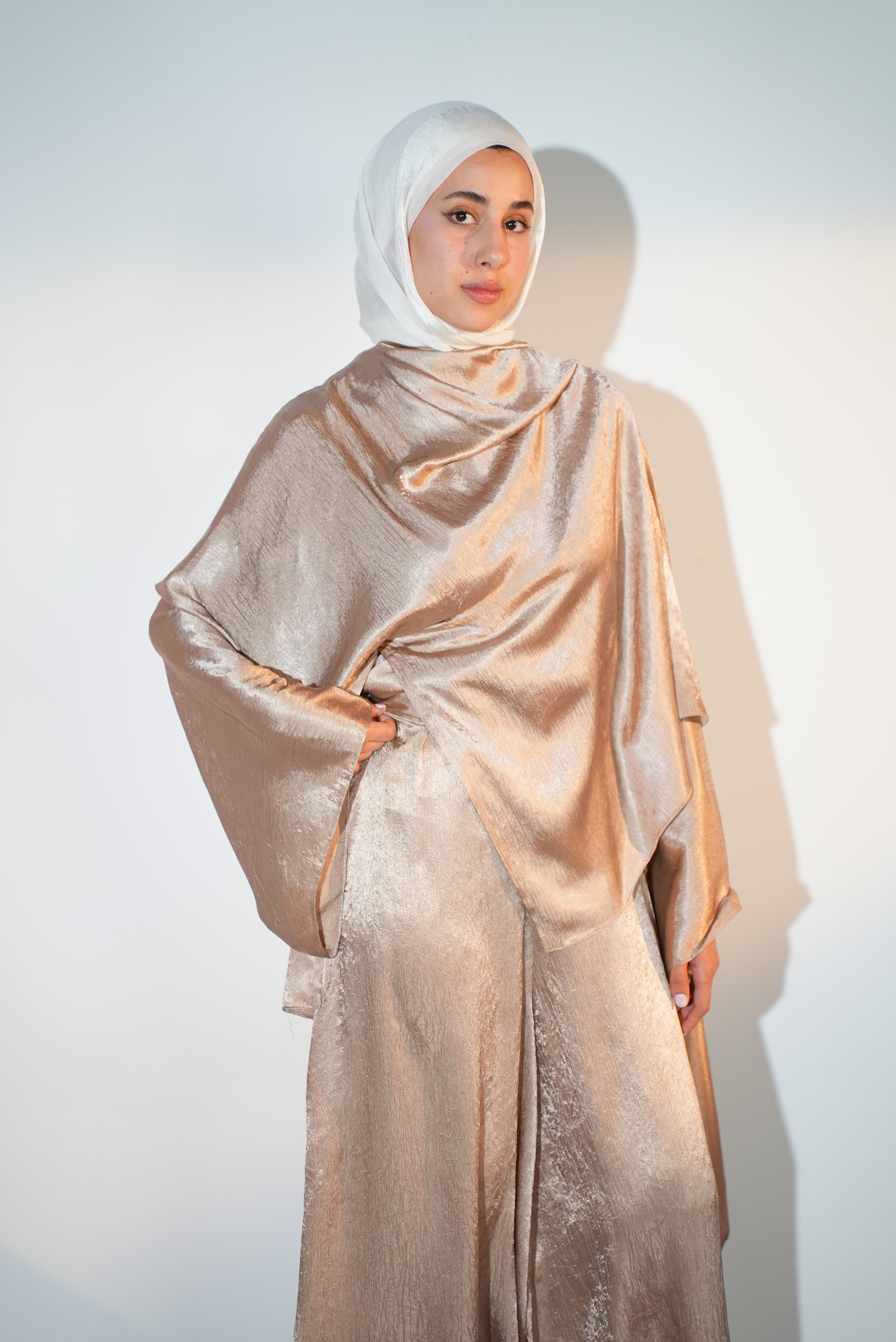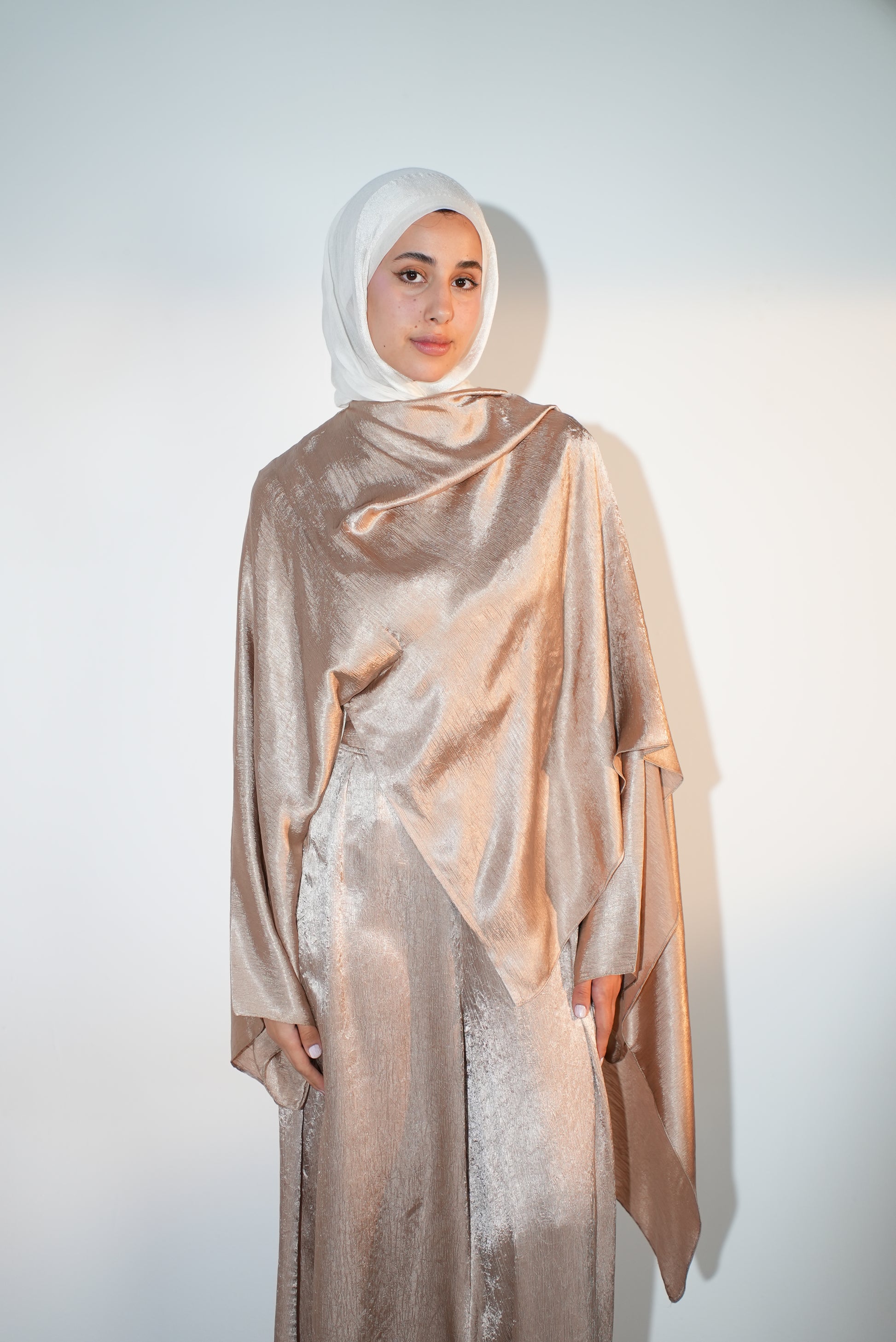 Upgrade your wardrobe with our Head Turner Shawl set in Rose gold. Made from premium Turkish textured satin, this statement set is not only stylish but incredibly comfortable. Plus, its versatile design allows you to wear it in three different ways. Elevate your fashion game with this must-have set.