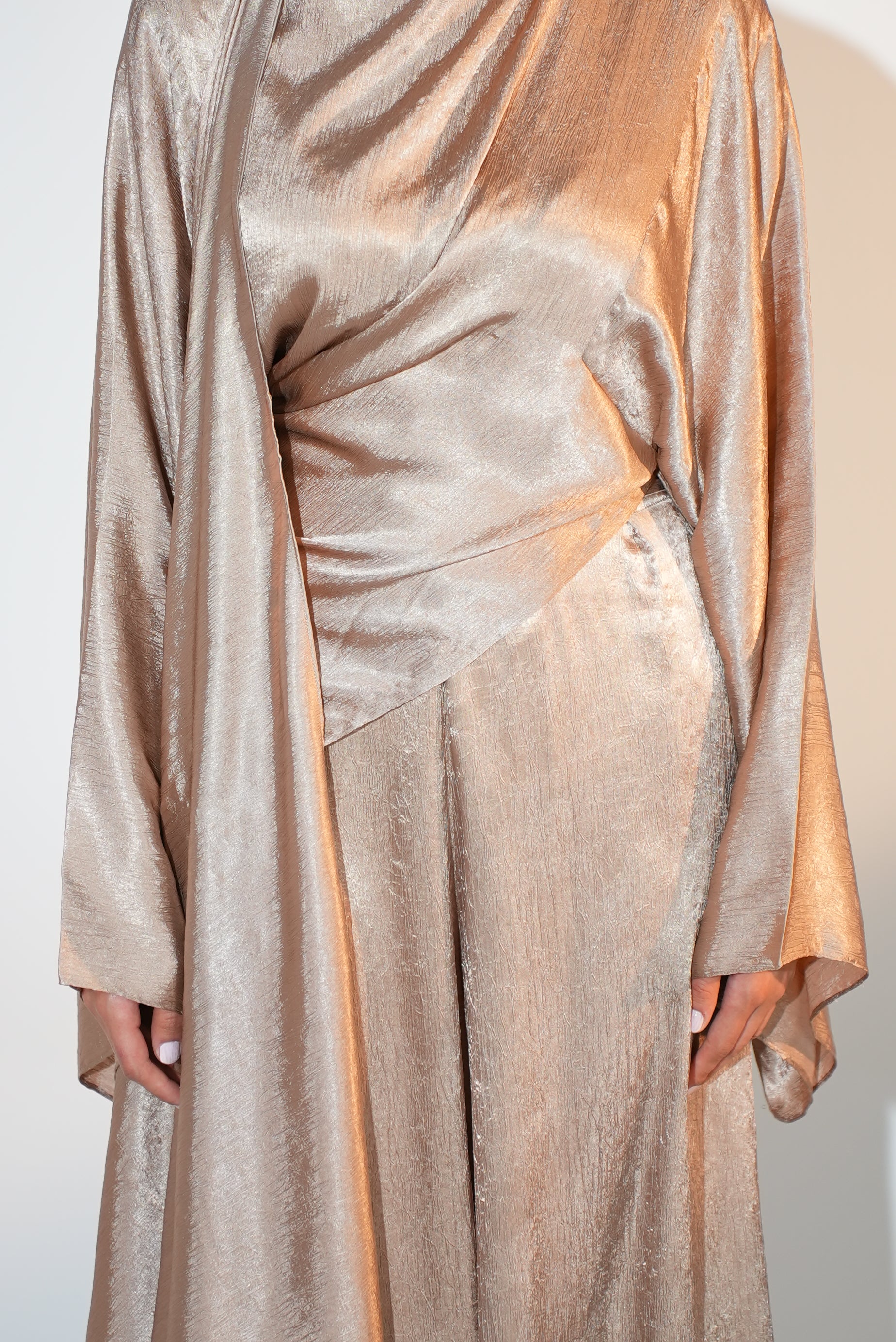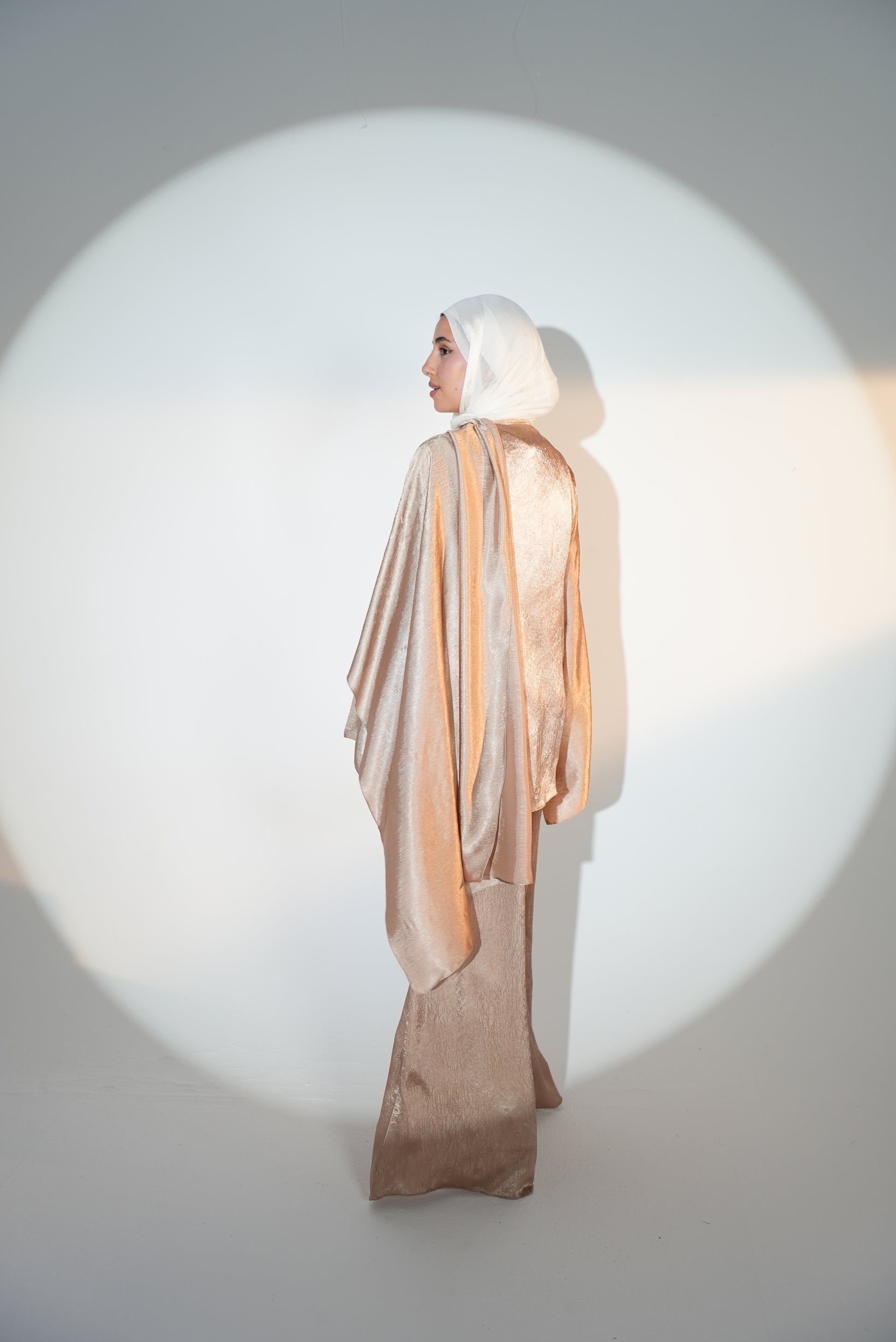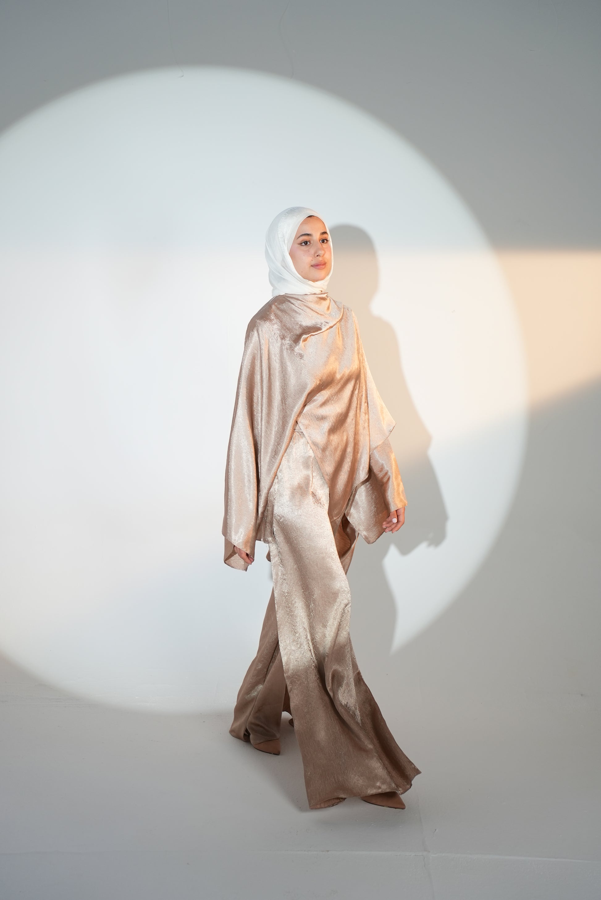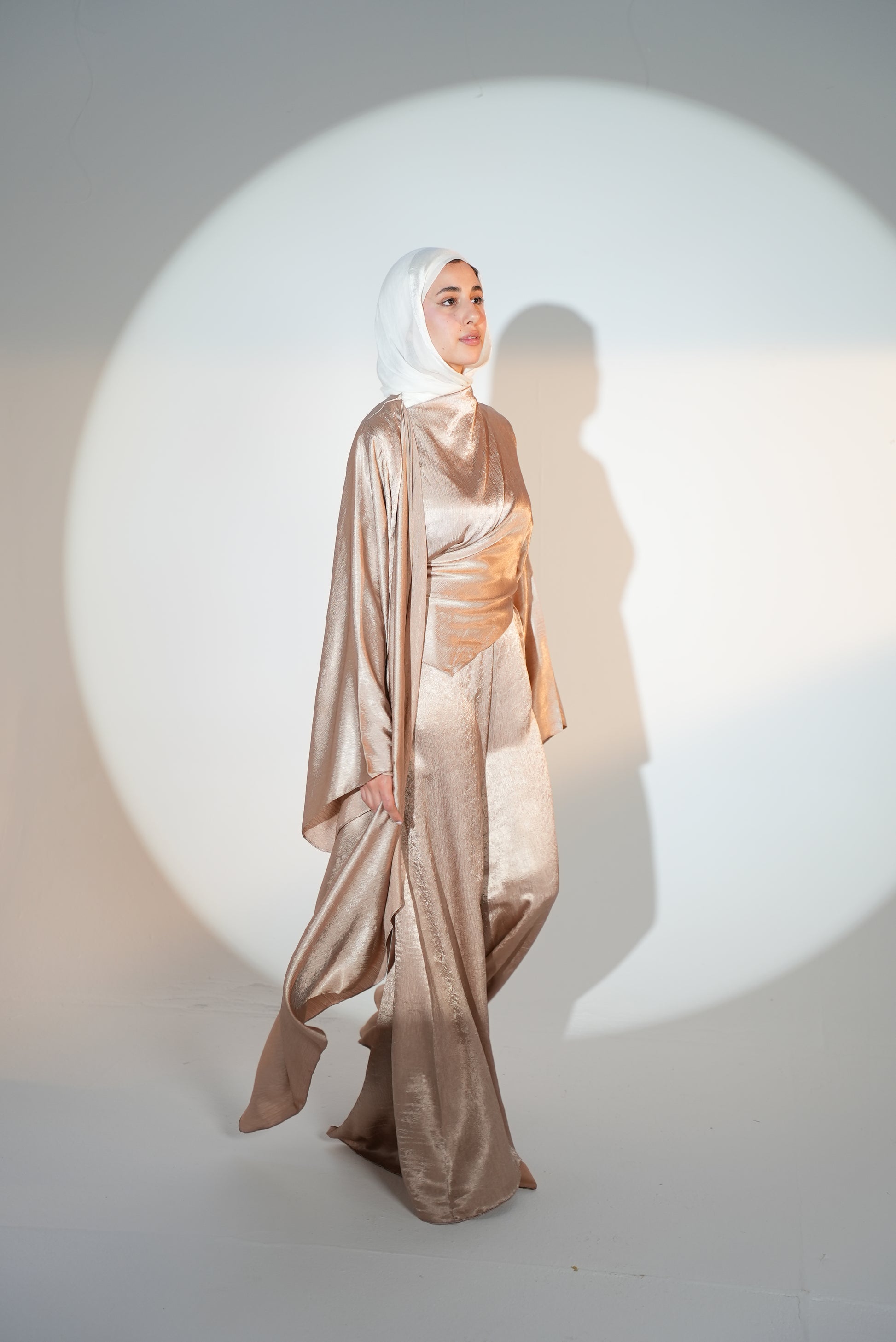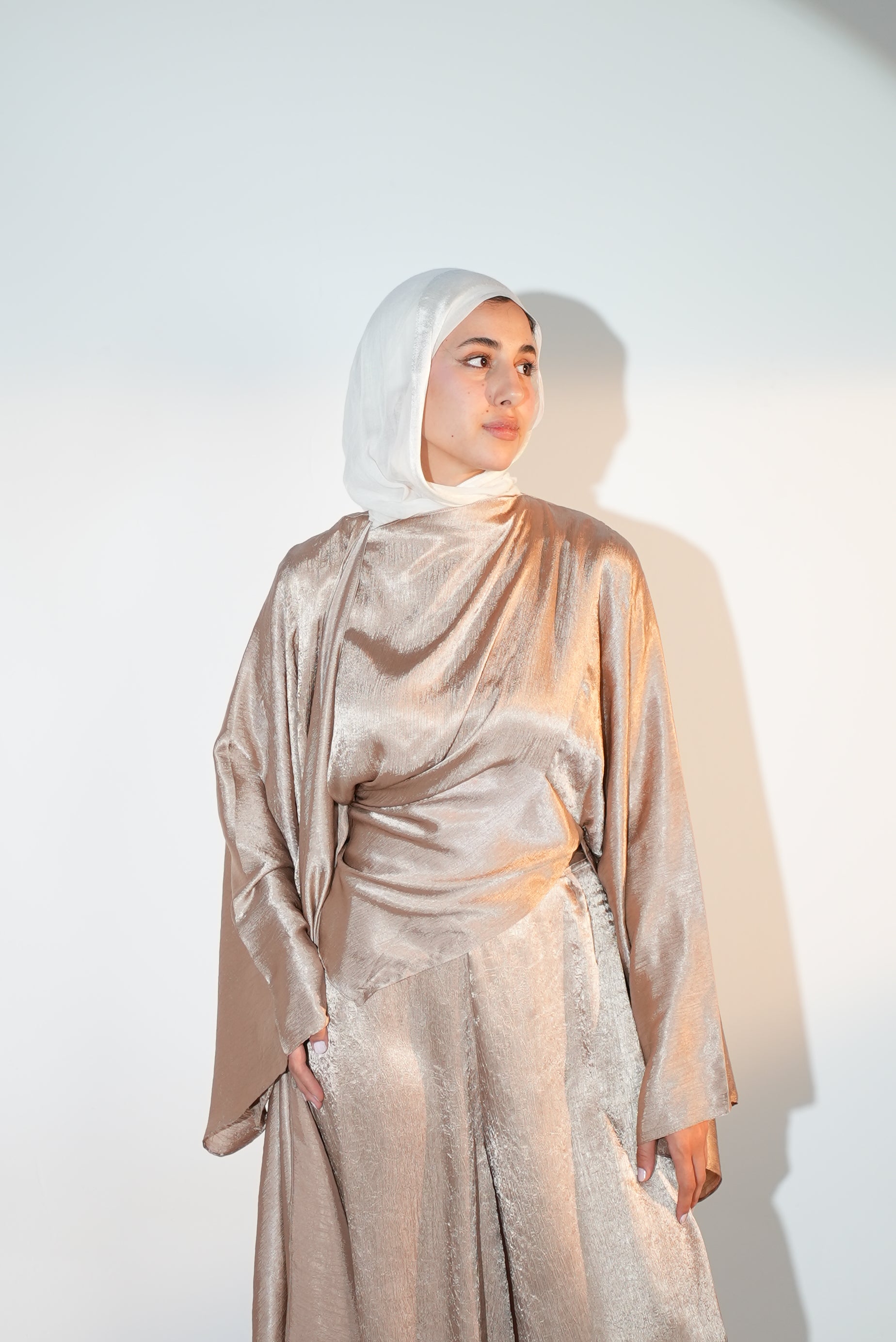 Upgrade your wardrobe with our Head Turner Shawl set in Rose gold. Made from premium Turkish textured satin, this statement set is not only stylish but incredibly comfortable. Plus, its versatile design allows you to wear it in three different ways. Elevate your fashion game with this must-have set.