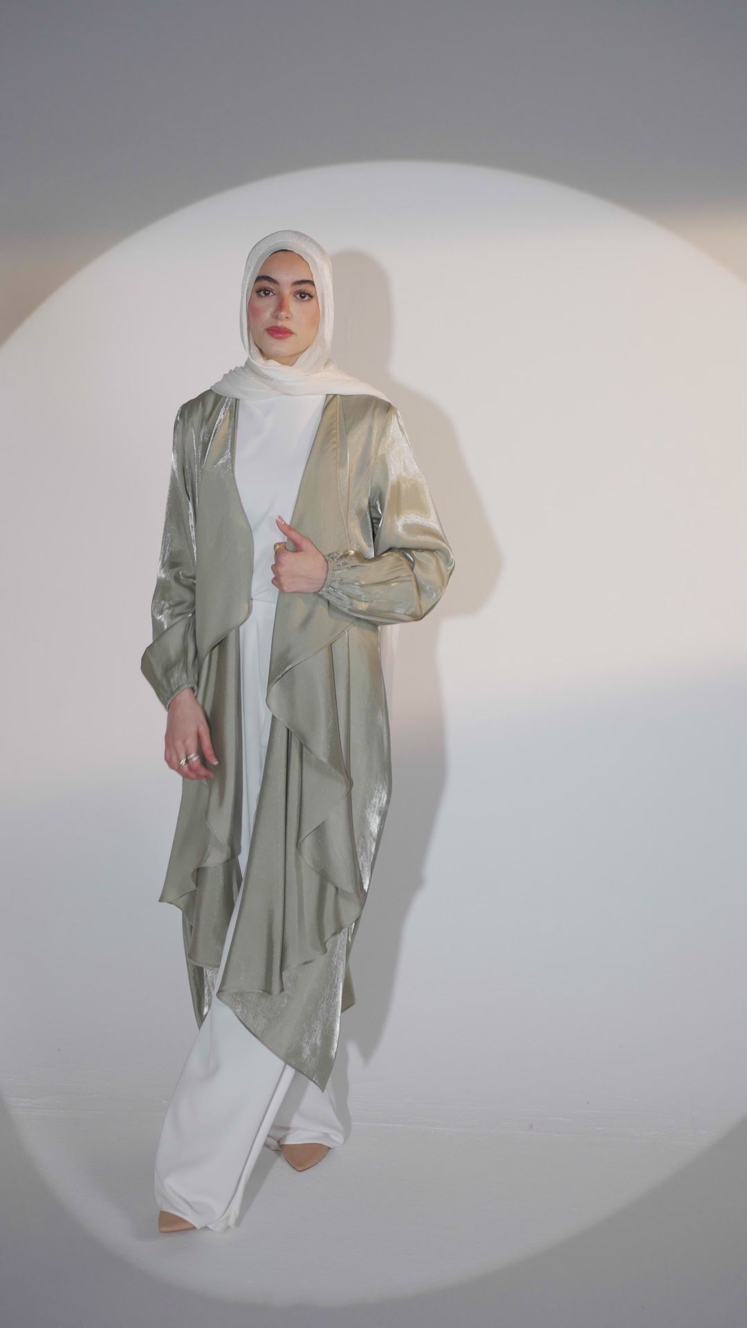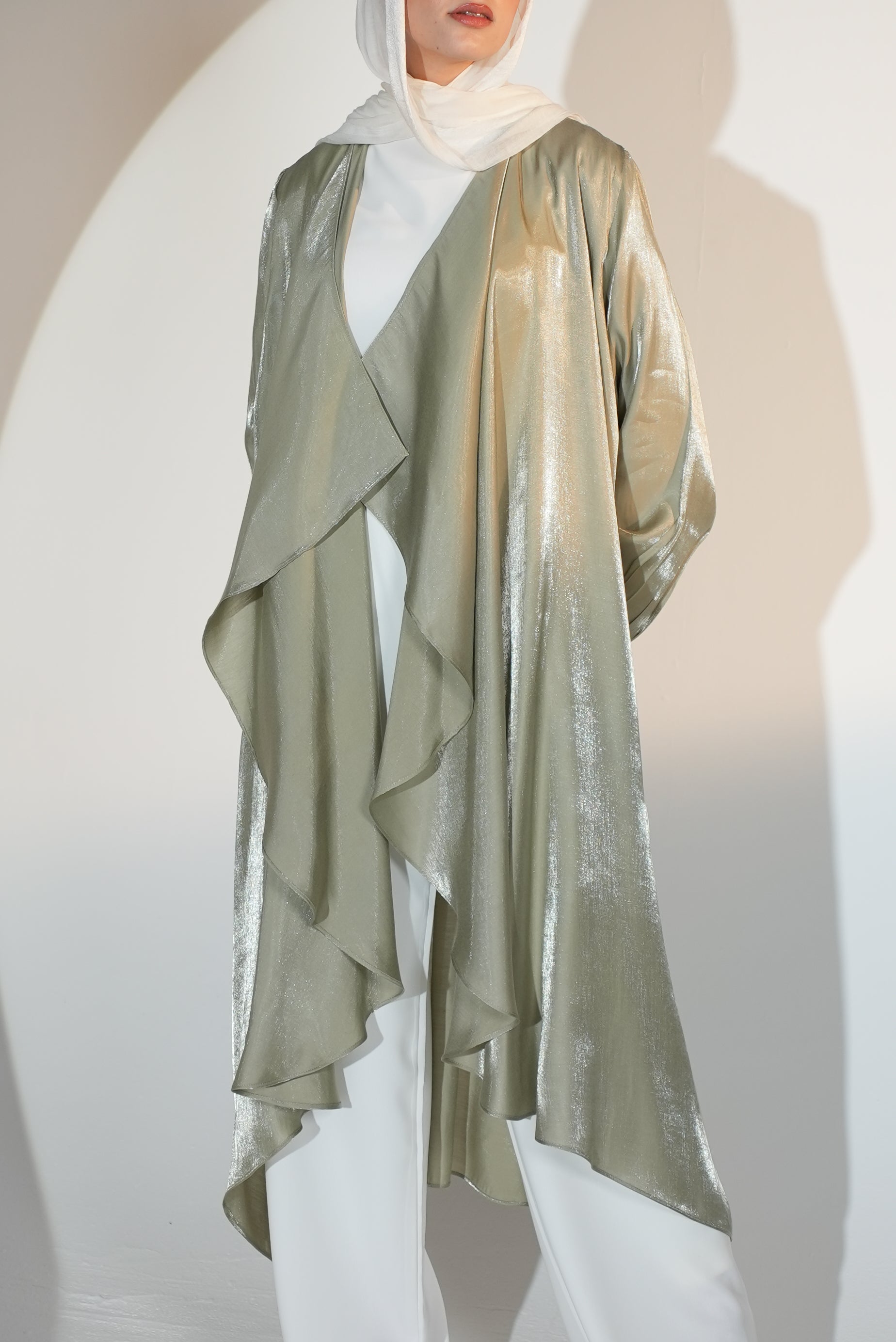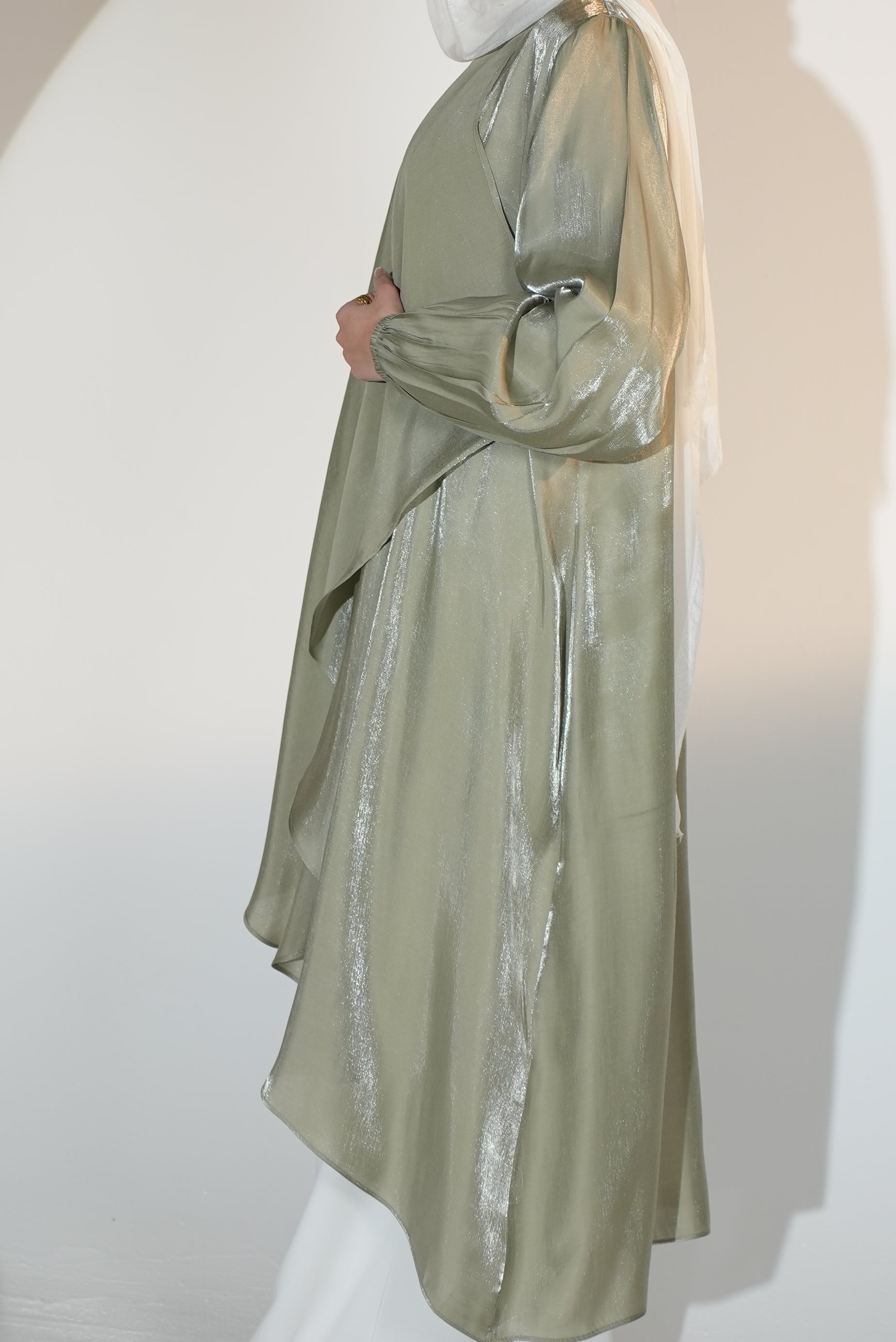 Indulge in elegance with our Shimmer Emilia Kaftan in the stunning shade of Matcha. This one-size kaftan features a shimmer fabric that will make you stand out in any crowd. Perfect for any occasion, this kaftan is a must-have for those who value both comfort and style.