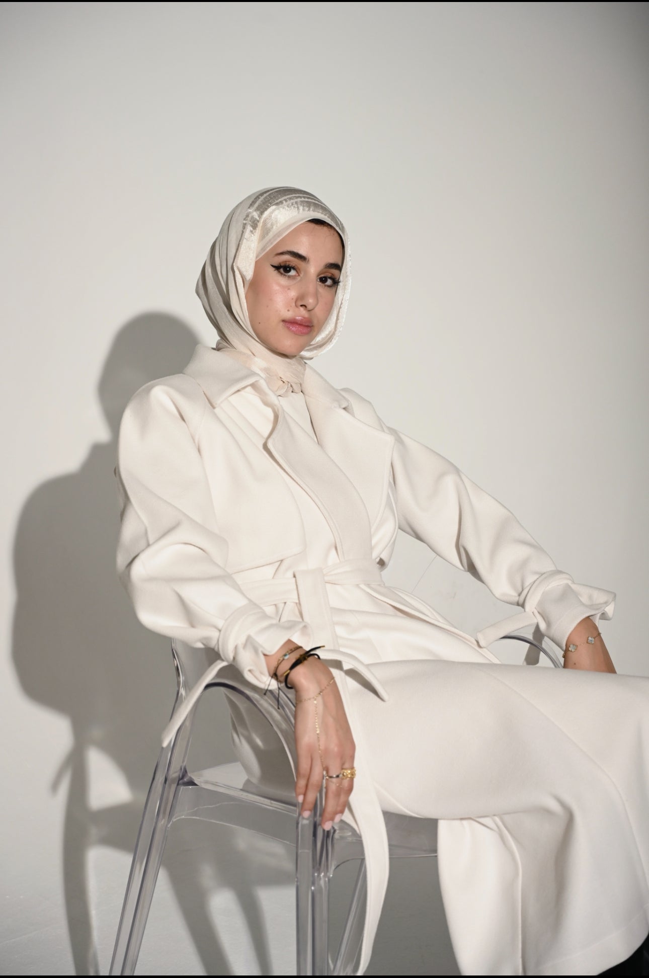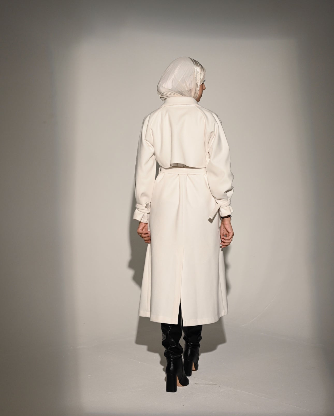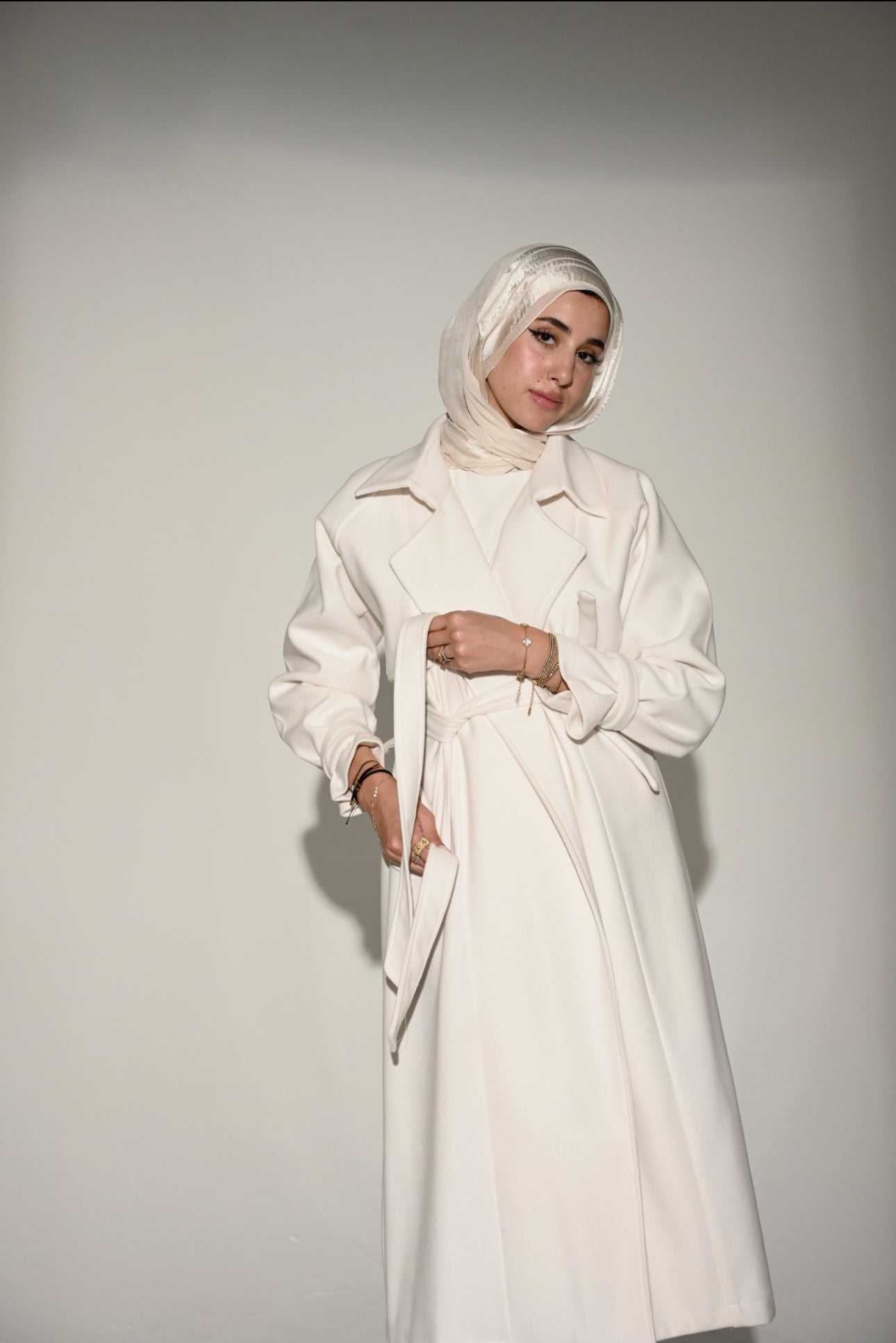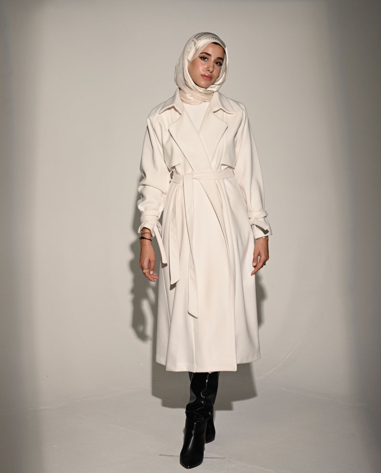 Introducing our Signature Wool Trench Coat in creamy white .A classic and flattering cut with bow tie sleeves and premium Wool fabric, this coat comes with a belt for a perfect fit.With a length of 123 cm and bust of 56 cm, it is one size and fits S, M, and L.Stay stylish and warm this season with our must -have trench coat.